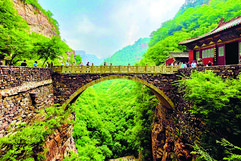 作为河北太行山文化旅游带的重要组成部分,石家庄段太行山横跨赞皇、井陉、元氏等县区,不仅拥有嶂石岩地貌、苍岩山古建等独特自然与人文资源,更在文旅融合、业态创新的浪潮中,不断地为“这么近,那么美,周末到河北”注入石家庄特色内涵,成为京津冀游客短途游的热门之选。■山水铸魂自然人文交相辉映行走在石家庄太行山,每一处景观都是大自然与历史的匠心之作。在赞皇县嶂石岩景区,分层清晰的红色砂岩构成了中国三大砂岩地貌之一的嶂石岩地貌。秋日清晨,云雾缠绕山间,阳光穿透岩层缝隙洒下,红色岩壁与绿色植被相映成趣,引得游客纷纷驻足。如果说嶂石岩展现了太行的雄奇,那井陉苍岩山则生动诠释了自然与人文的完美融合。山间的福庆寺内,一座单孔石桥凌空横跨峭壁,桥上殿宇飞檐翘角、悬于半空,形成“桥楼殿”经典景观。站在山脚下仰望,云雾缭绕间,古建仿佛漂浮于仙境。苍岩山成为热门游戏取景地而“破圈”,景区顺势推出多项活动,吸引大批年轻玩家慕名而来,让千年古建与流行文化碰撞出别样火花。壮美的山川是太行之“骨”,深厚的历史文化便是太行之“魂”。井陉县作为“太行八陉”之一的重要节点,秦代便设郡置县,